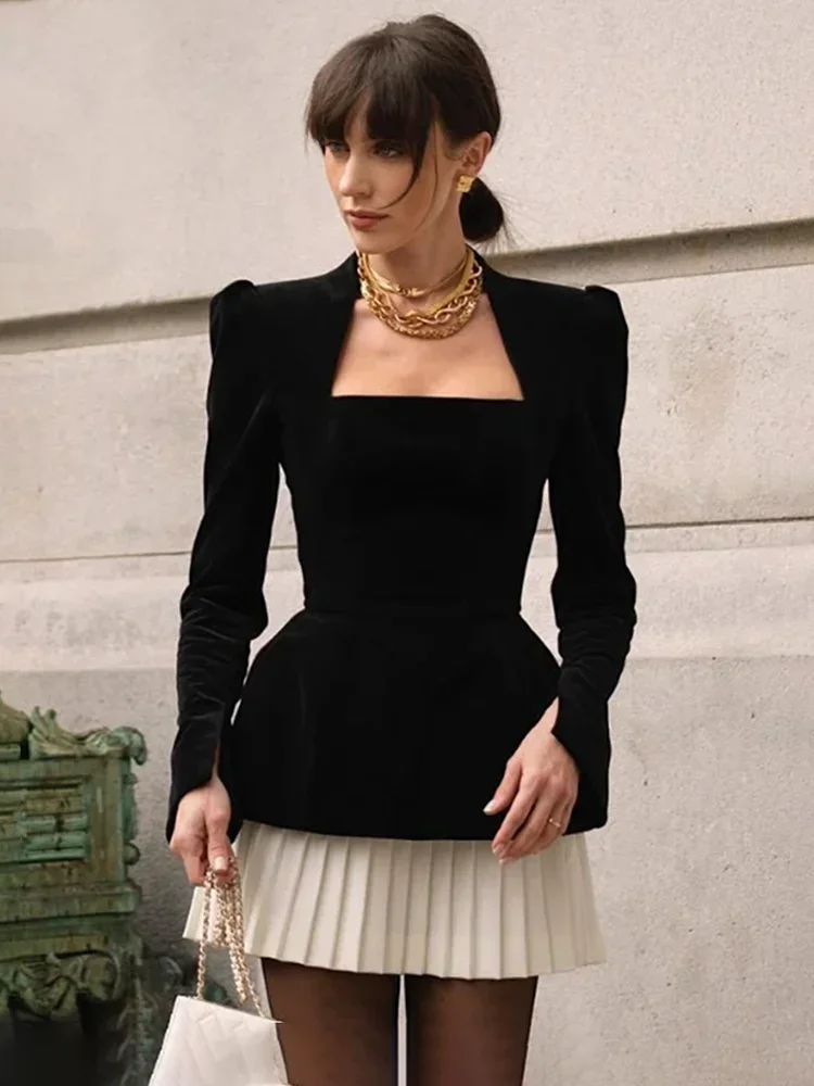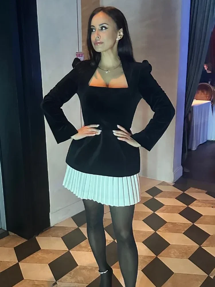 • TARUXY Fashion Long Sleeve Pleated Dress Elegant Contrast Color Office Woman Velvet Short Dress Splice Slim Vestidos Party Dress