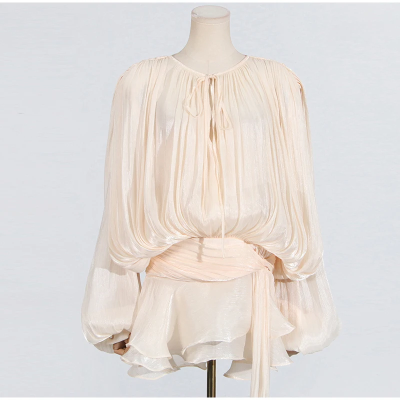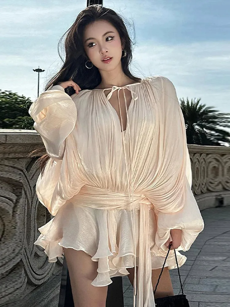Hollow Out Blouse Mini Dress Women Elegant Loose V Neck Lace Up Dresses Female 2025 Spring New Long Lantern Sleeves Ladies Robe