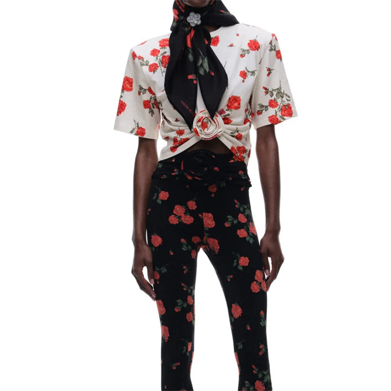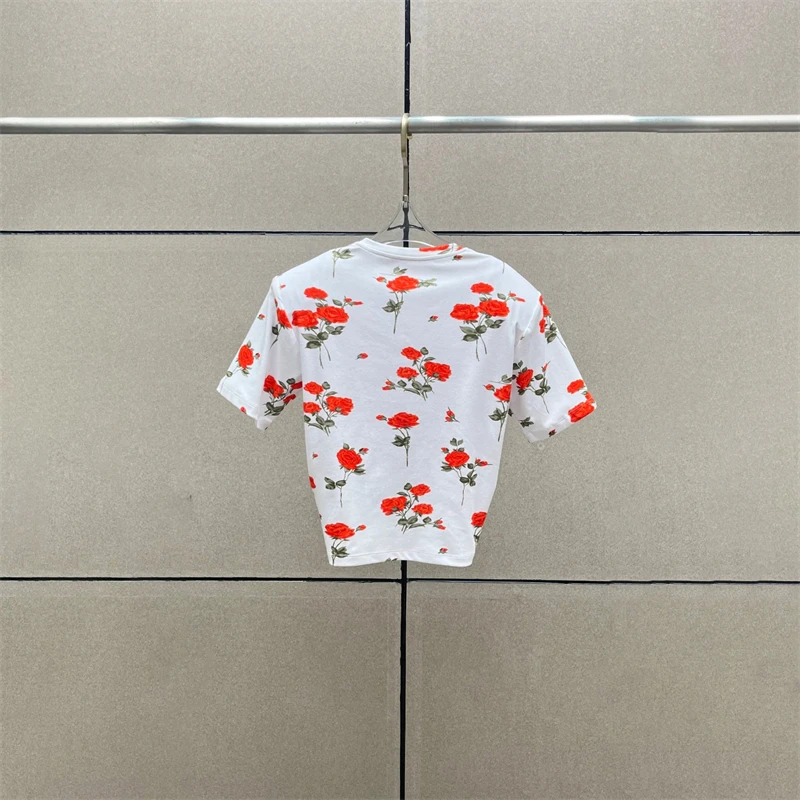 • Summer 2025 Women's round Neck Pure Cotton Printed Knot Shoulder Pad Short Sleeve T-Shirt Y2K High Quality Short Top