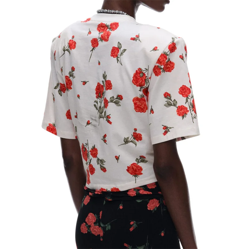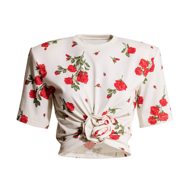 Summer 2025 Women's round Neck Pure Cotton Printed Knot Shoulder Pad Short Sleeve T-Shirt Y2K High Quality Short Top
