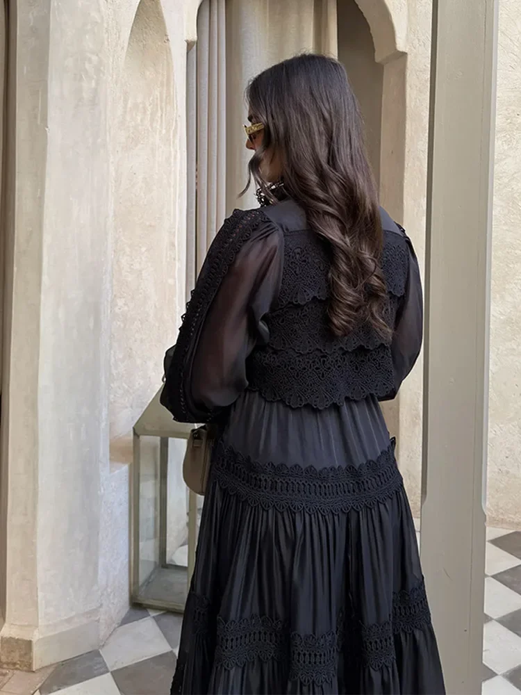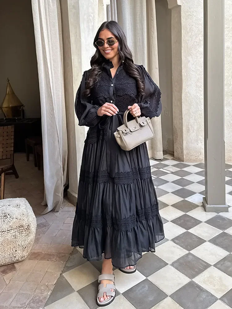 Hollow Out Embroidery Patchwork A-line Long Dress Elegant Women Long Sleeve High Waist Lapel Pleated Dresses Holiday Ruffle Robe