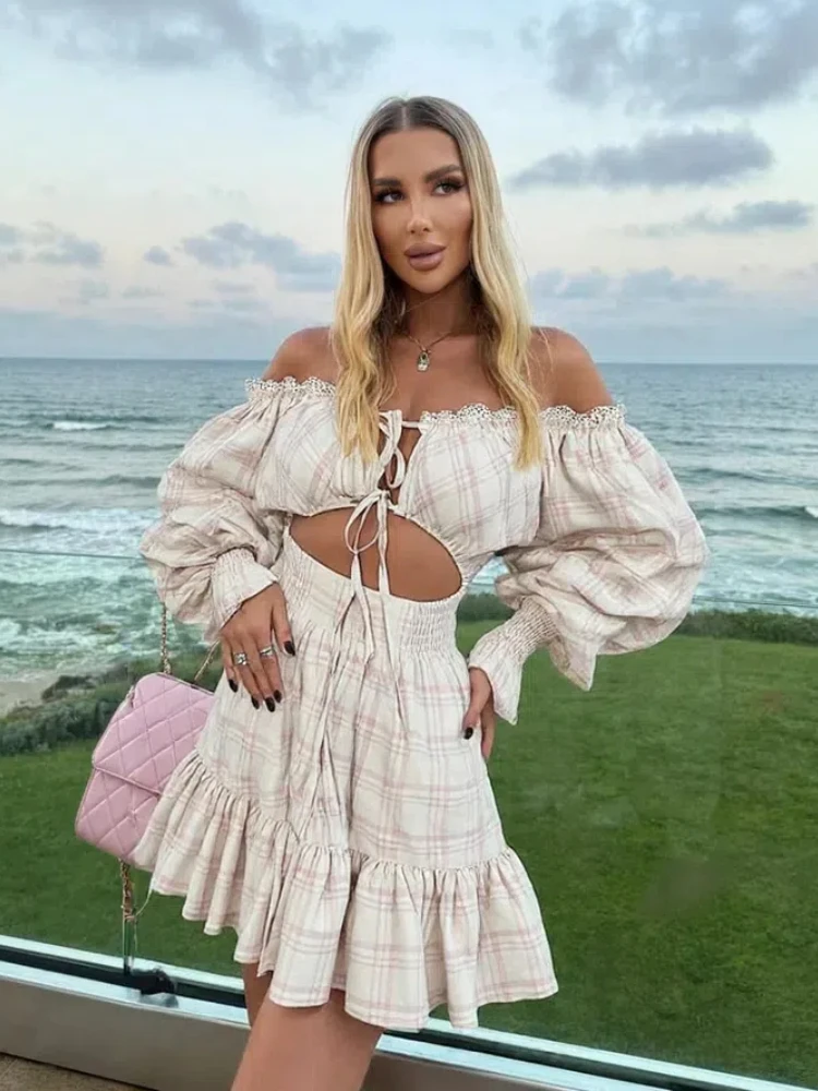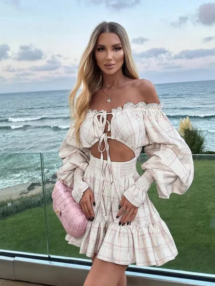 • Off the Shoulder Lace Up Lantern Long Sleeve Dress Women Sexy Hollow Out Backless Lace Patchwork Short Dresses Chic Ladies Robes
