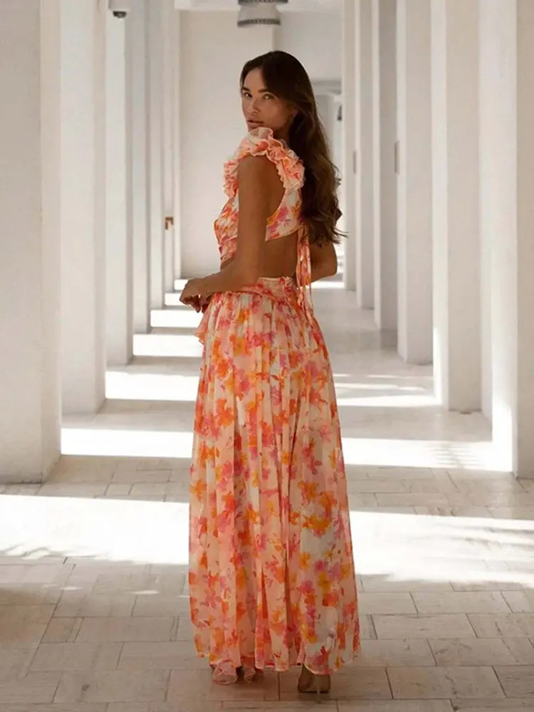 • Women's V Neck Ruffle Sleeves Printed Long Dresses Elegant Beach Vacation 2025 Summer Fashion Backless Lace-up Sleeveless Dress