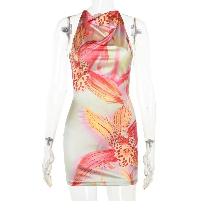 • Elegant Casual Summer 2025 Women's Printed Halter Neck Large Backless Slimming Wrap around Skirt Dress Vacation Style