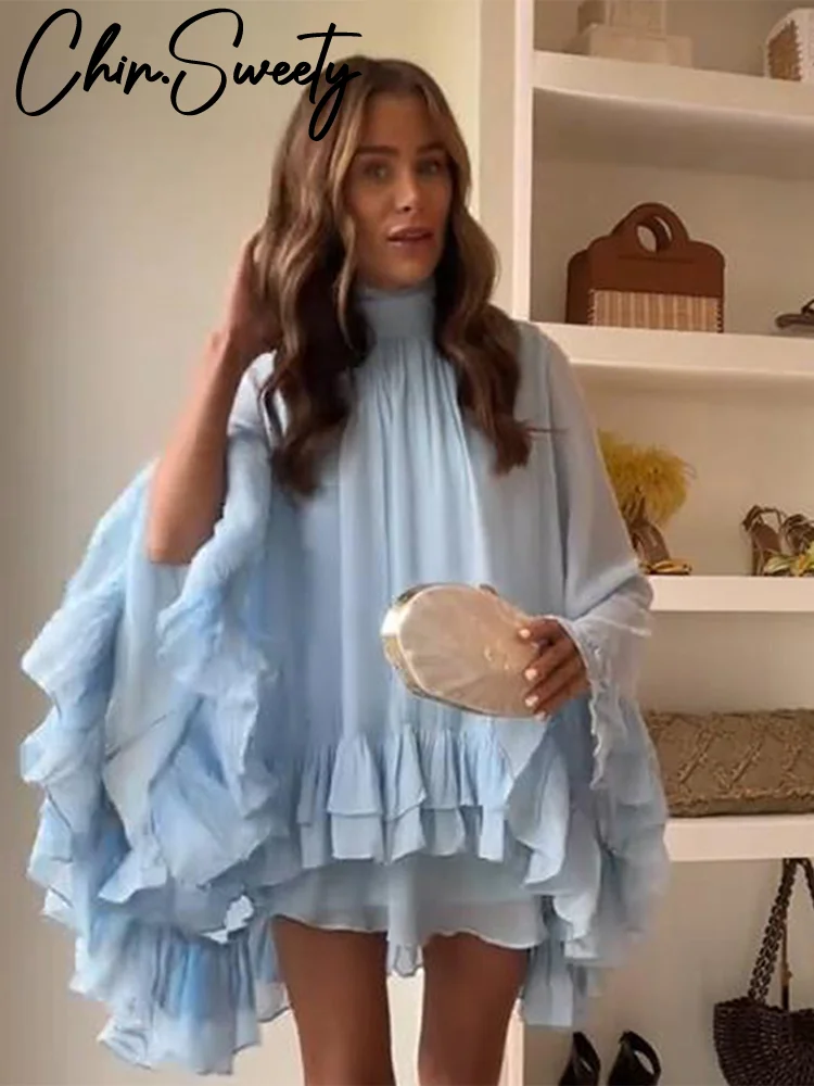 Elegant Multi Layers Ruffles Women Short Dress Loose Turtleneck Flare Sleeve Shirt Dresses Female 2025 Spring Lady Party Robes