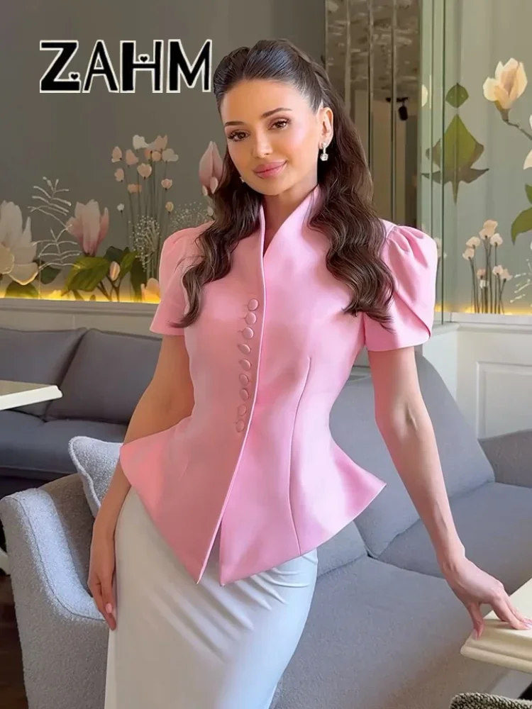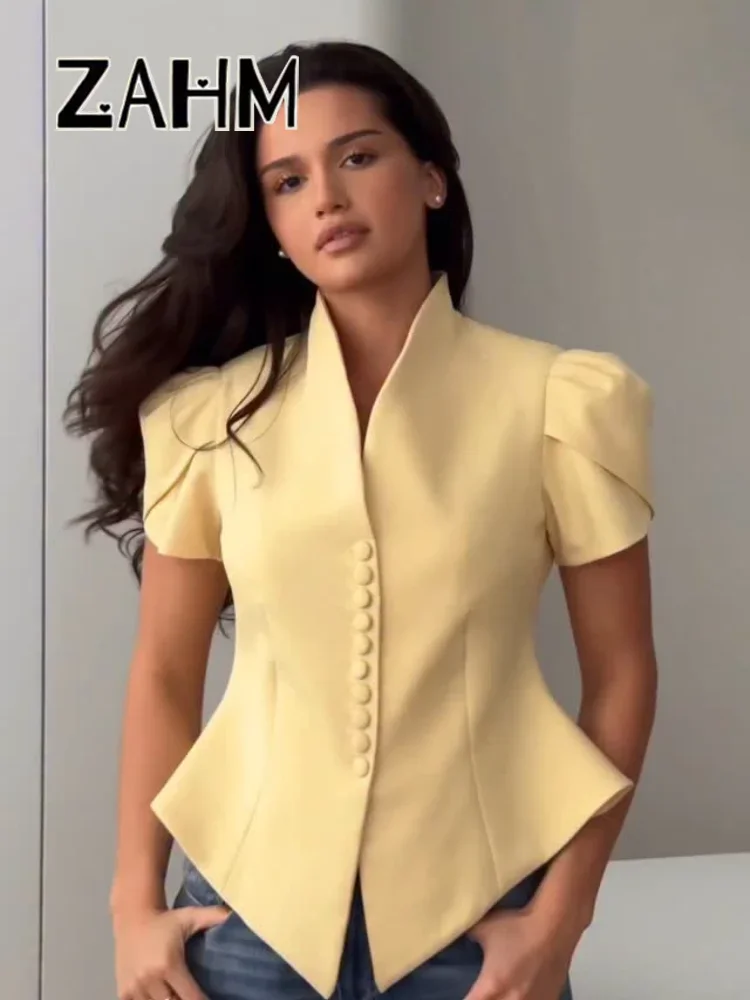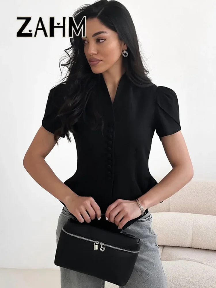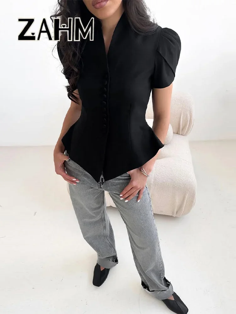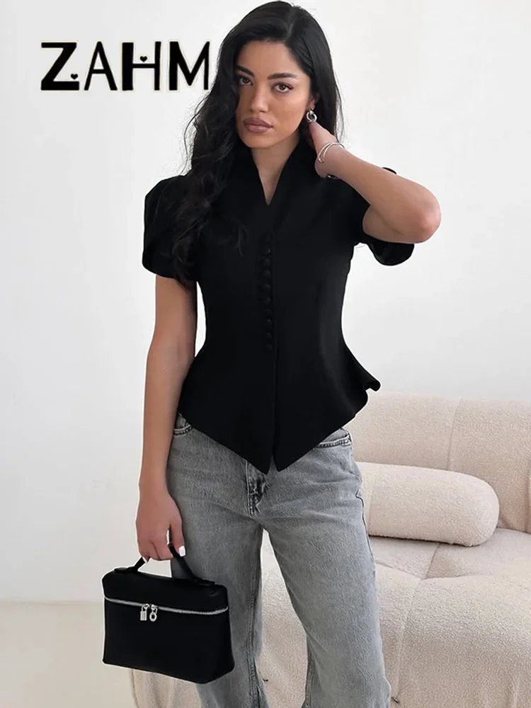 • Elegant Slim Waist Shirts Women Black Short Sleeve Stand Collar Buttons Irregular Female Shirt New Lady Tops 2025 Summer